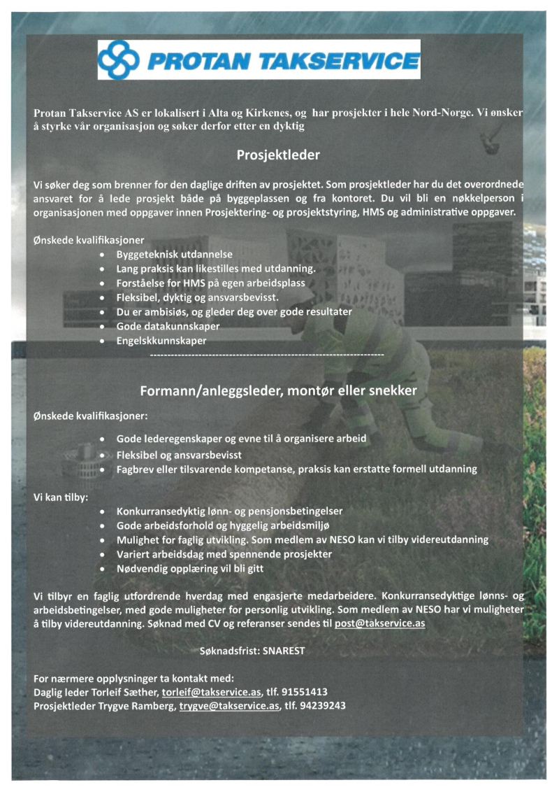 Protan Takservice AS jest jedną z największych firm działających w branży dekarskiej w północnej Norwegii z trzydziestoma wykwalifikowanymi pracownikami. Firma nasza jest zlokalizowana w mieście ALTA jak i Kirkenes nasze projekty są realizowane na terenie całej północnej Norwegii. Nasza chęć rozwoju ciągle wzrasta i dlatego potrzebujemy wzmocnić naszą firmę. Przyszedł czas na to aby zatrudnić wykwalifikowanych pracowników do naszej firmy, z branży dekarskiej zarówno mężczyzn jak i kobiety.